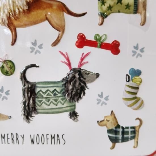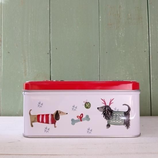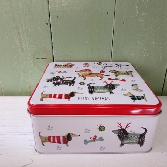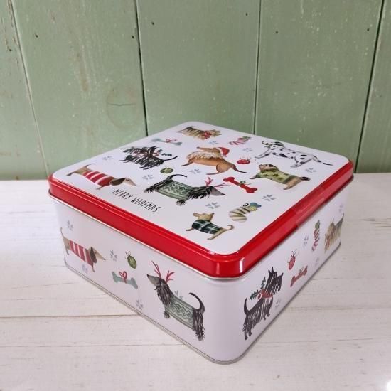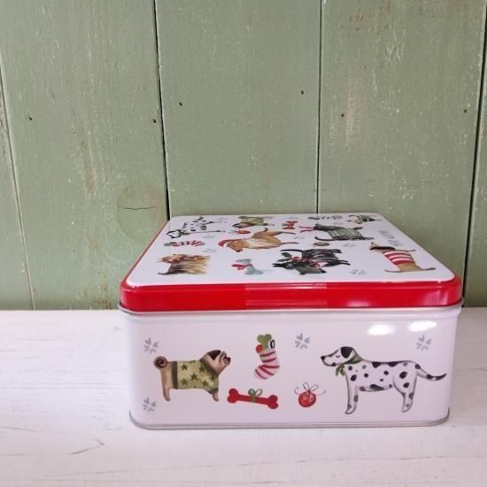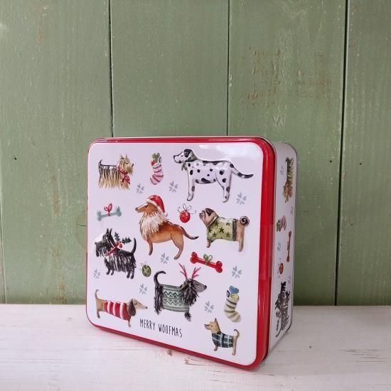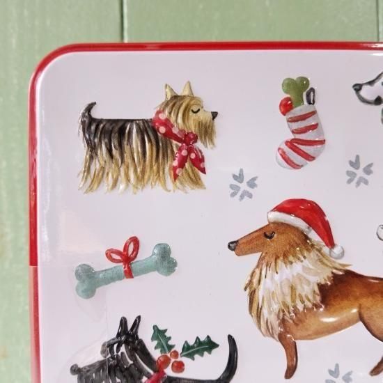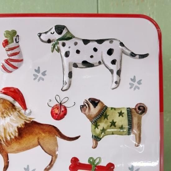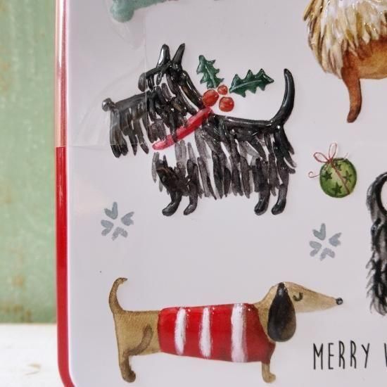 セーターを着たさまざまな愛らしい犬が描かれている、冬季限定缶です。英国製。
